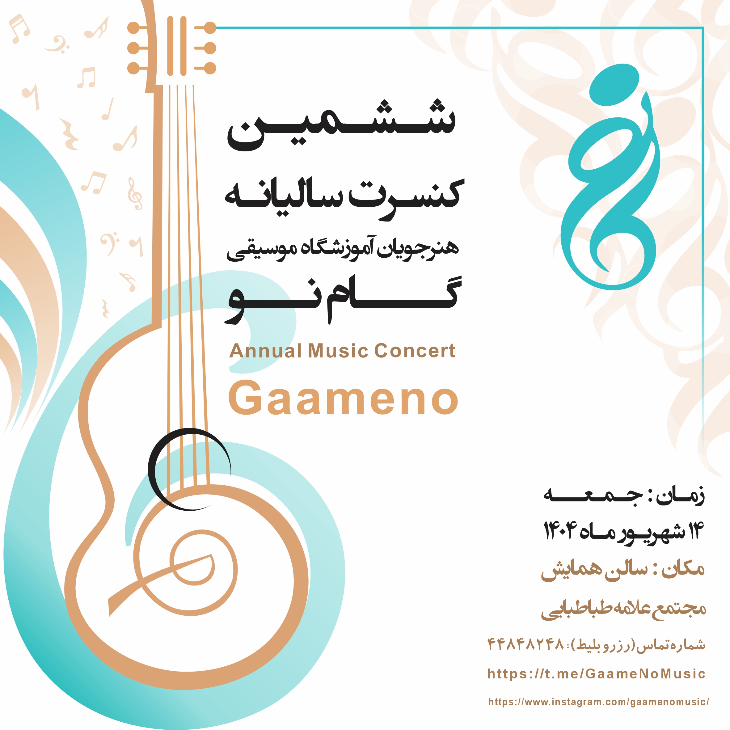 کنسرت سالیانه آموزشگاه موسیقی گام نو در قالب دو کنسرت و بصورت مجزا و با اجرای گروه نوازی نوازندگان برتر آموزشگاه گام نو در سالن همایش مجتمع علامه طباطبایی برگزار می گردد.